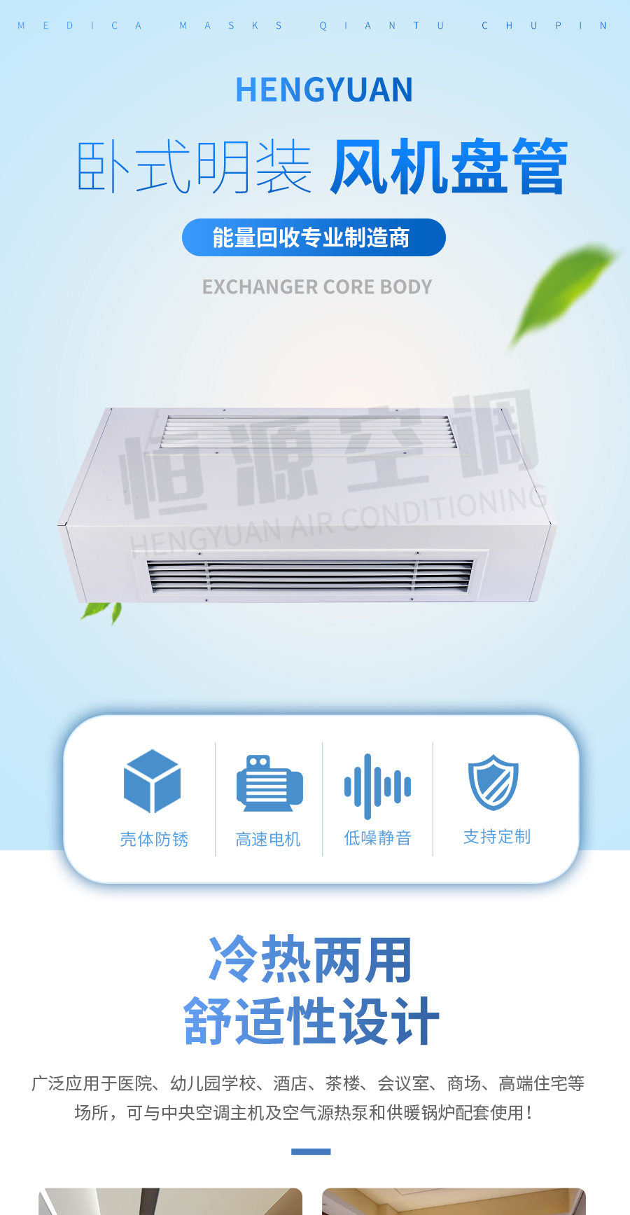 風機盤管機組簡稱風機盤管。它是由小型風機、電動機和盤管(空氣換熱器)等組成的空調系統末端裝置之一。盤管管內流過冷凍水或熱水時與管外空氣換熱,使空氣被冷卻,除濕或加熱來調節室內的空氣參數。它是常用的供冷、供熱末端裝置。